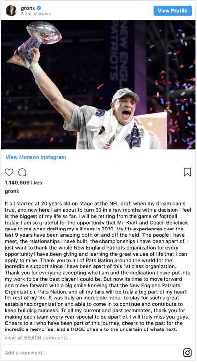 Rob Gronkowski just announced his retirement on Instagram. #RobGronkowski #Patriots