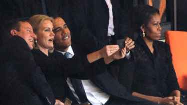 President Barrack Obama selfie with British and Danish Prime Ministers during Nelson Mandela funeral